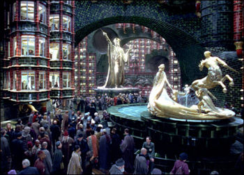 No meio do hall existe uma fonte, e um grupo de estátuas douradas, maiores que o tamanho natural ficam no meio do círculo de água. O maior de todos, é um bruxo de nobre olhar apontando sua varinha para o céu, ao seu lado uma bela bruxa, um centauro, um duende e um elfo doméstico, os últimos três olham como que adorando os bruxos. (Essa fonte foi destruída na ocasião da batalha no departamento de mistérios).